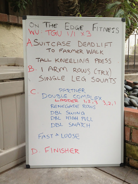 Part C. Just as my beautiful handwriting says. You must use the same bells for all the exercises in the complex, UNLESS you have 8kg's. If you do the Renegade Rows you must use at least 12kg's, then you can quickly switch. Follow the rep scheme as you and your partner pace each other. It's only 12 reps all together when you are done with everything.